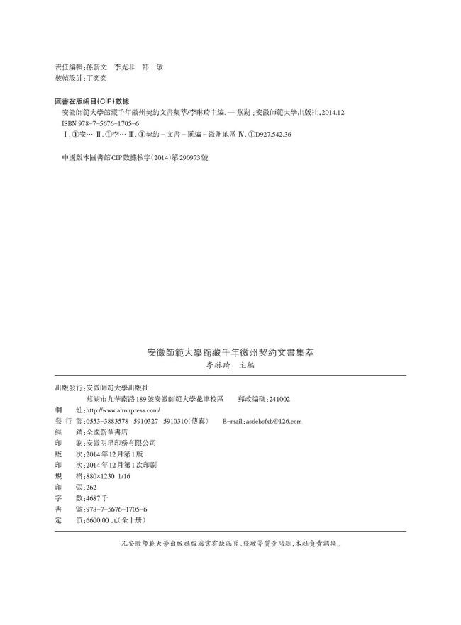 日前,由安徽师范大学李琳琦教授主编、中国区域文化研究院执行副院长刘道胜教授等担任副主编的《安徽师范大学馆藏千年徽州契约文书集萃》(精装,全10册),由安徽师范大学出版社2014年12月出版。该资料集萃选馆藏中颇具特色的簿册文书,内容丰富,涉及族产、商业、诉讼、实征册、鱼鳞图册、保甲册等诸多类型,是安徽师范大学馆藏徽州文书首次集中公开面世。本次出版的安徽师范大学馆藏徽州文书,数量较大,类型较丰富,对于推进相关领域的研究具有重要意义。(康 健)
